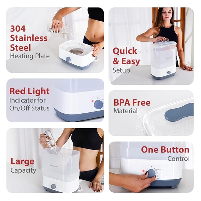 a) Steriliser: Add Water up to 120ml in the Base Unit and then place 2-3 bottles & turn the Knob to Steriliser mode (10-12)minutes.